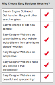 Whether you’ve just started your home staging business or are looking for a website solution that allows YOU to add or delete photos and content anytime you like, then Easy Designer Websites is your perfect solution. The Easy Designer Websites have SEO (search engine optimization) which means getting found in Google is made easier.