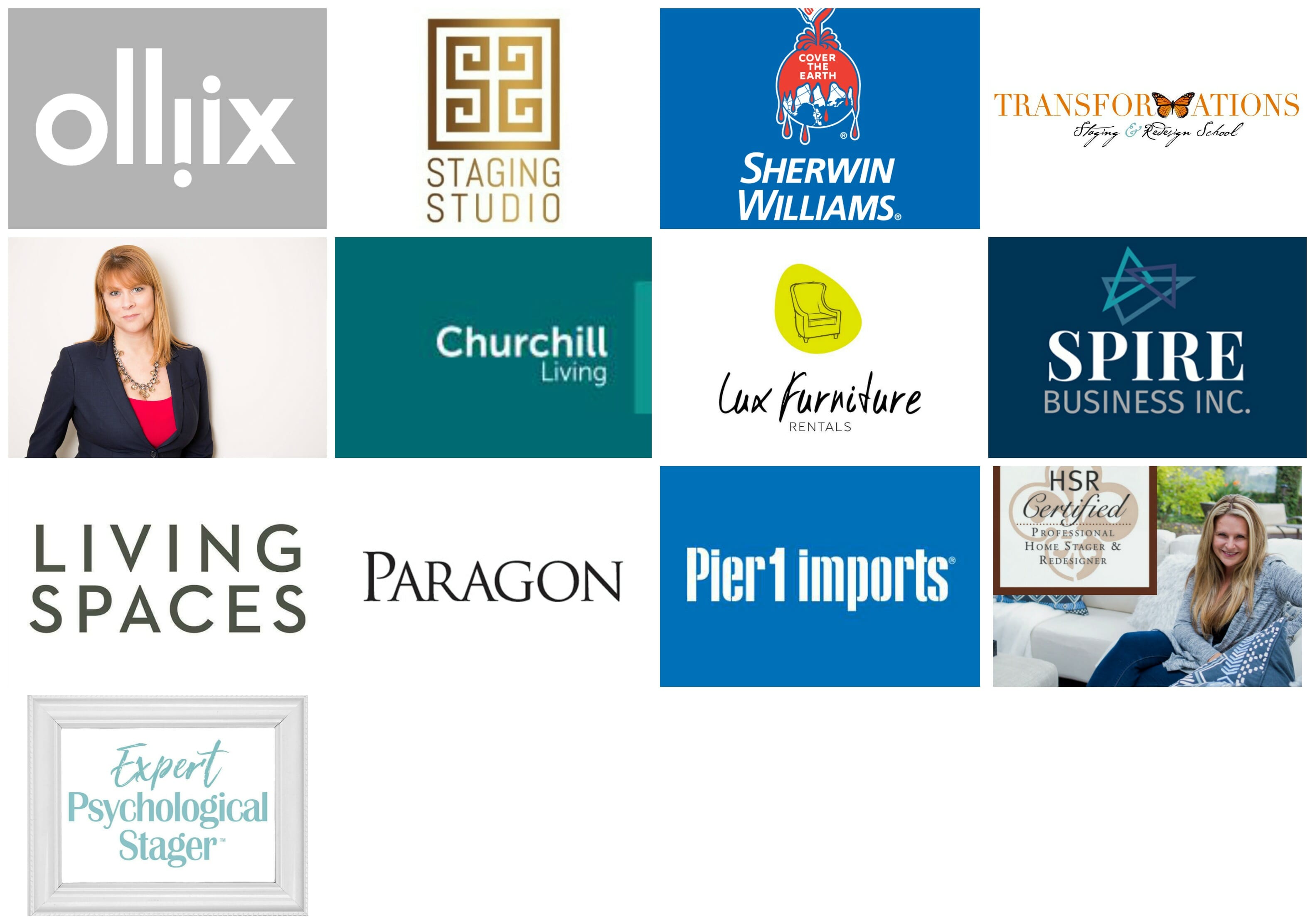 OlliixStaging Studio, Sherwin Williams, Transformations Staging & Redesign School, Carolyn Dickinson Success CoachingChurchill Living, Lux Furniture Rentals, Spire Business Inc, Living Spaces, Paragon, Pier 1 imports, Home Staging Resource, Expert Psychological Stager