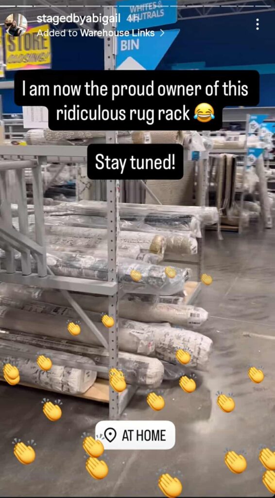 Check out her finds on Instagram under her story highlight “Warehouse Links” @stagedbyabigail. You’ll see those $100 racks the day she got them — including the “ridiculous rug rack” she now proudly owns.