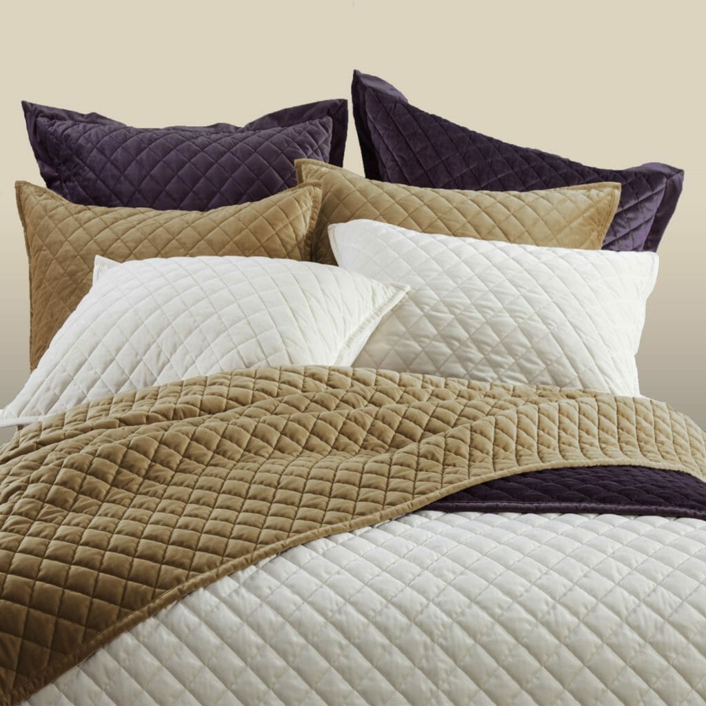 Our velvet or satin quilts bring a more traditional look to your bedroom collections; while our Matelassé coverlets or linen quilts, which tend to be thinner, are perfect for creating a more tailored or casual vibe. It is easy to achieve this look in your staging by switching the layers, rotating the quilt to become the primary bed covering on the bed. Fold the duvet or comforter down to the foot of the bed to keep that pretty pop of print or add volume.