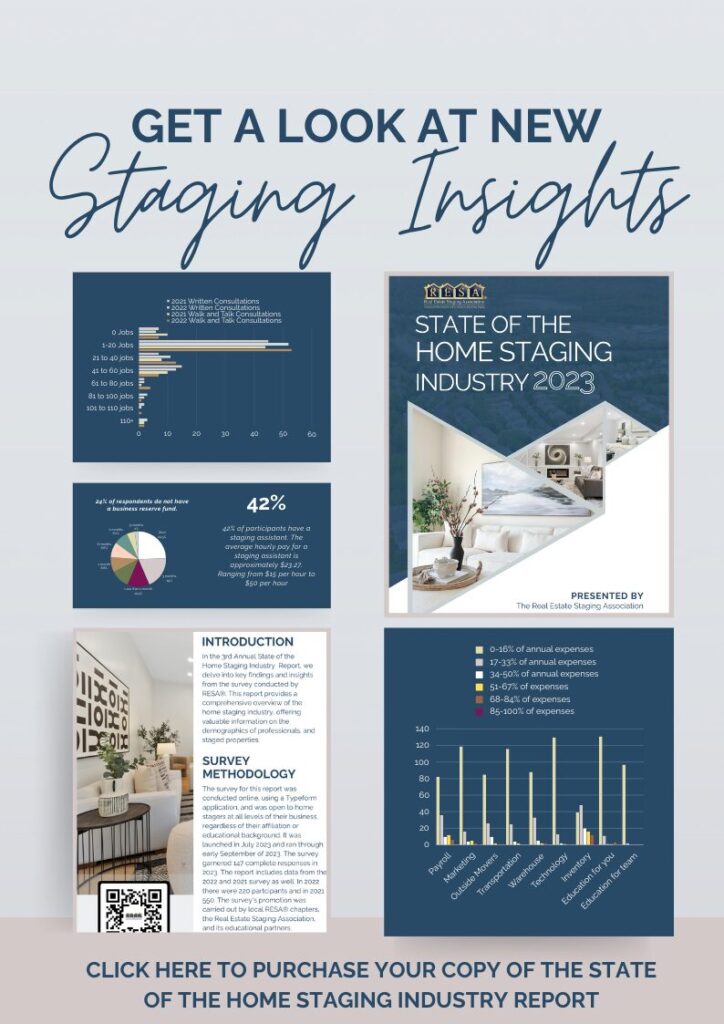 To stay at the forefront of home staging business trends in North America, I highly recommend consulting the ‘State of the Home Staging Industry Report‘. This comprehensive report will provide you with valuable data about how home staging companies are allocating their budgets, what they are paying their employees, how much they spent in inventory in 2022 and 20223 + more, aiding you in aligning your business strategies with the latest developments in the staging industry.