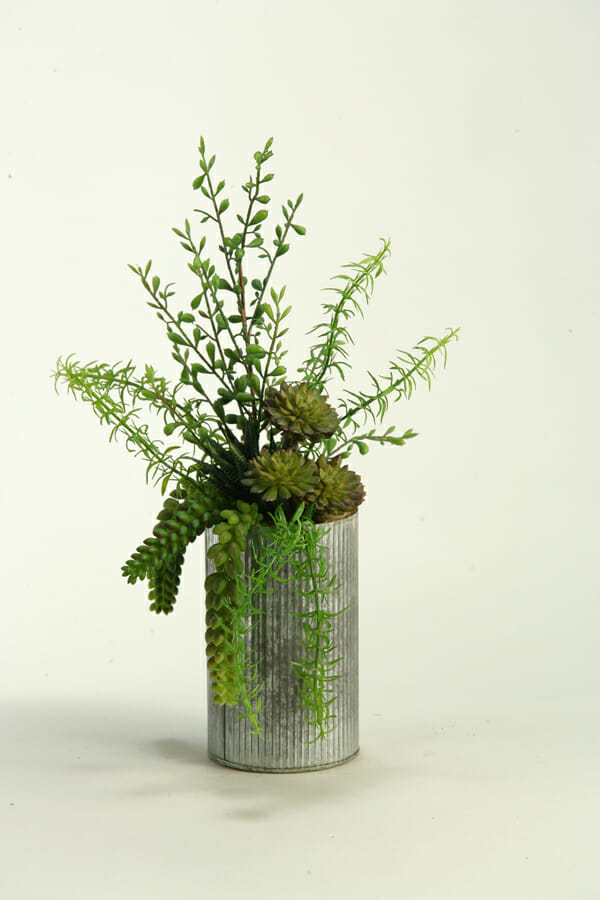 Choose the right container to fit the space and style of the room you are staging. The arrangement above works well for shabby chic, country or even a more modern urban industrial decor. It features aloe, burro tail and succulents in a corrugated metal vase.