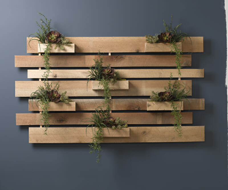 - Create a wall ‘scene’ by hanging several succulents in planters or within a large wooden display when there is not much room for planters or to create interest on a large blank wall.