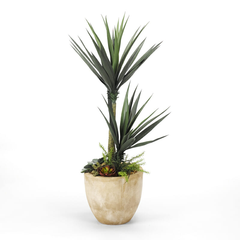 Transform a sunroom or outdoor area into a luscious tropical oasis with both large and small artificial tropical plants. (Above) Aloe plant with succulent underplanting in round planter