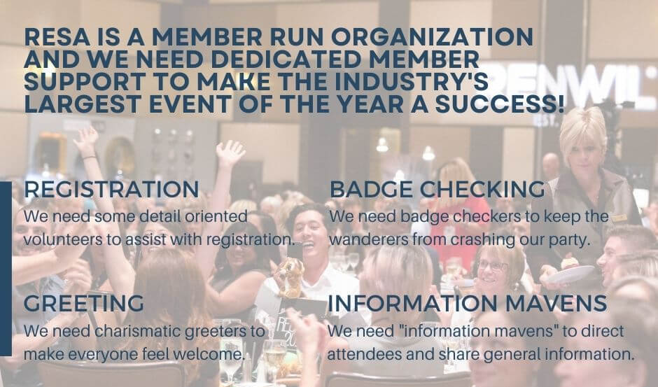 As a non-profit association without an army of personnel, tending to all of our guests and overseeing every detail at RESACON can be challenging. RESA® is a member-run organization and we need dedicated member support to make the industry’s largest event of the year a success! We need some detail-oriented volunteers to assist with registration, charismatic greeters to make everyone feel welcome, badge checkers to keep the wanderers from crashing our party and ‘information mavens’ to direct attendees and share general information.