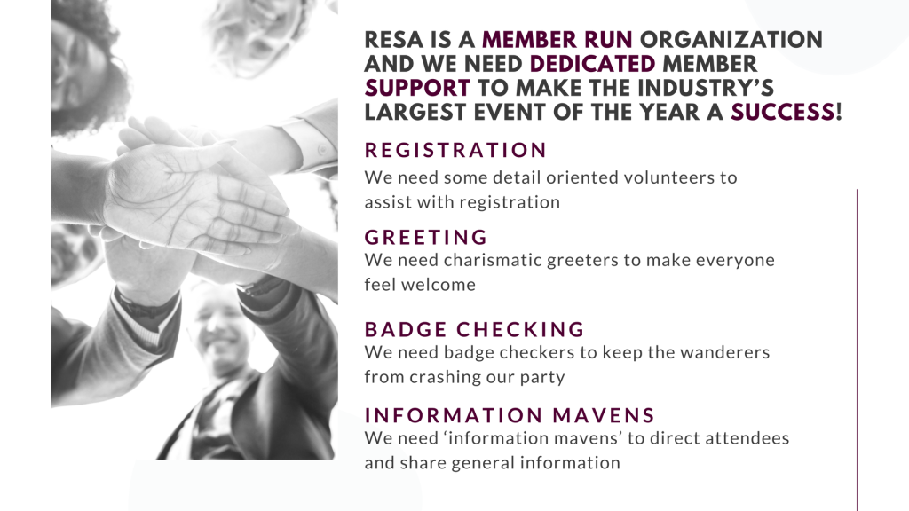 As a non-profit association without an army of personnel, tending to all of our guests and overseeing every detail at RESACON can be challenging. RESA is a member run organization and we need dedicated member support to make the industry’s largest event of the year a success! We need some detail oriented volunteers to assist with registration, charismatic greeters to make everyone feel welcome, badge checkers to keep the wanderers from crashing our party and ‘information mavens’ to direct attendees and share general information.